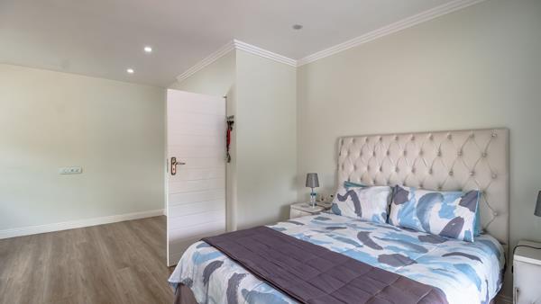 Two generously proportioned guest bedrooms are positioned on the ground floor, each featuring laminate flooring and built-in cupboards. One bedroom includes air conditioning and a full en-suite bathroom, while a separate full guest bathroom and guest cloakroom provide effortless convenience for visitors.