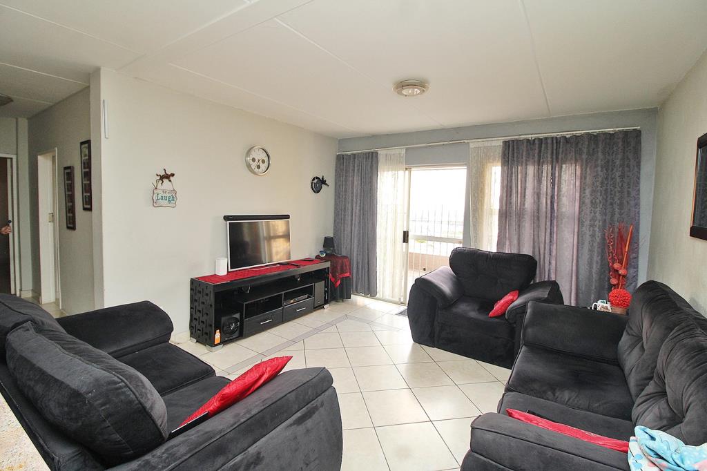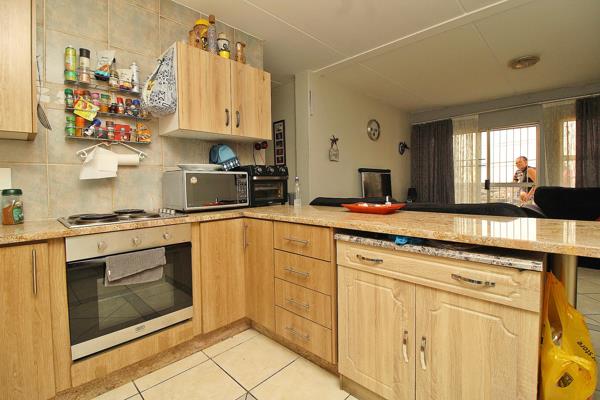 A sliding door leads to a large, covered entertainment patio, complete with a built-in braai, offering breathtaking views of the city skyline. The unit boasts three bedrooms, each with built-in cabinetry. The main bedroom includes an en suite bathroom with a bath, single basin, and loo. The second bathroom is fitted with a shower, single basin, and loo.