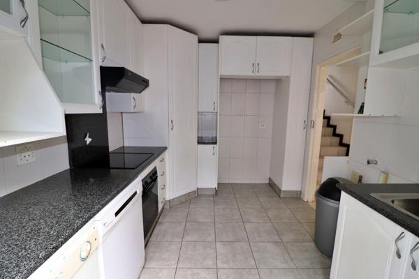 Modern kitchen with granite finishes and space for appliances that opens onto the courtyard.