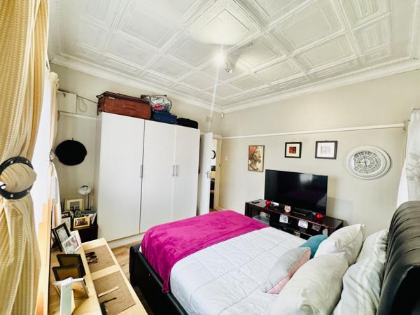 The main bedroom is fitted with built-in cupboard, curtain rails, high ceilings, a double bed, and finished with laminated wooden flooring.