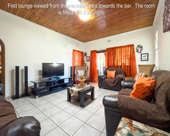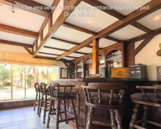 The dining room is situated between the two living areas. The main lounge leads out to a completely stunning bar area, which in turn leads to a partially enclosed entertainment area with a built-in braai as well as a sparkling pool. On the other side of the dining room there is a second lounge which can be used as a TV-room, games room etc. This room also leads out into the braai area.