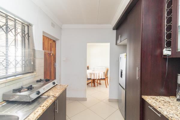 The newly built 2-bedroom flatlet is tiled throughout and impresses with its spacious design, including an open-plan lounge, dining room, and kitchen with a gas stove. Both bedrooms feature built-in cupboards and are serviced by a full bathroom with a bath, shower, basin, and toilet.