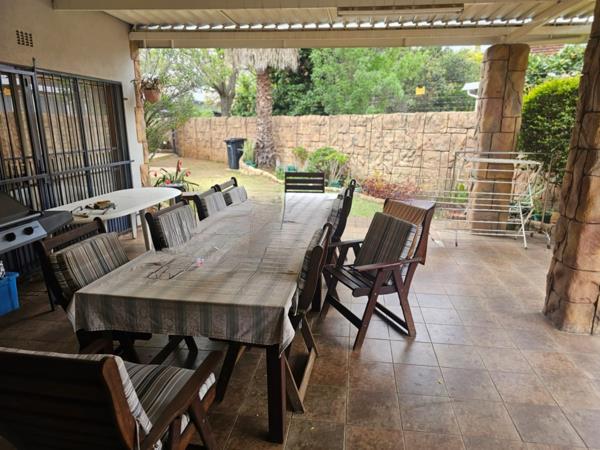 The property excels in outdoor living and entertainment. A large swimming pool with a spacious tiled patio is ideal for relaxation, complemented by lush greenery and palm trees. The expansive covered patio, complete with a built-in braai, offers an excellent venue for al fresco dining. A unique, rustic pub-style bar area, featuring exposed wooden beams and brick walls, provides an intimate setting for social gatherings. Further amenities include a jacuzzi, a garden, and outside toilets.