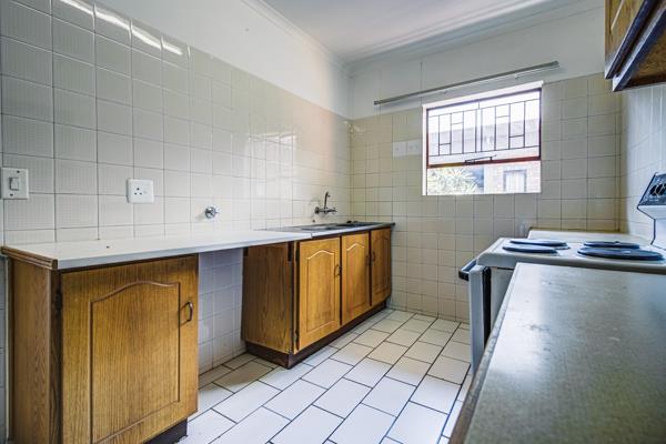 The galley-style kitchen, equipped with wooden cabinets, tiled surfaces, a double sink, and an electric stoveoven, offers essential amenities, though it presents an opportunity for modern upgrades. Both bedrooms are well-proportioned, benefiting from ample natural light, and are fitted with security bars on the windows for enhanced safety. The single bathroom serves the unit efficiently.