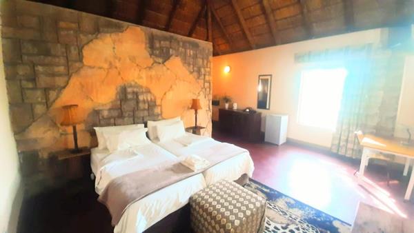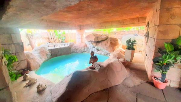 Step outside to your very own oasis with a sparkling splash pool, surrounded by a beautifully landscaped garden with various water features, offering a tranquil environment for relaxation. The thatch roof provides a unique charm while ensuring comfort throughout the seasons - keeping things cool in summer and warm in winter.