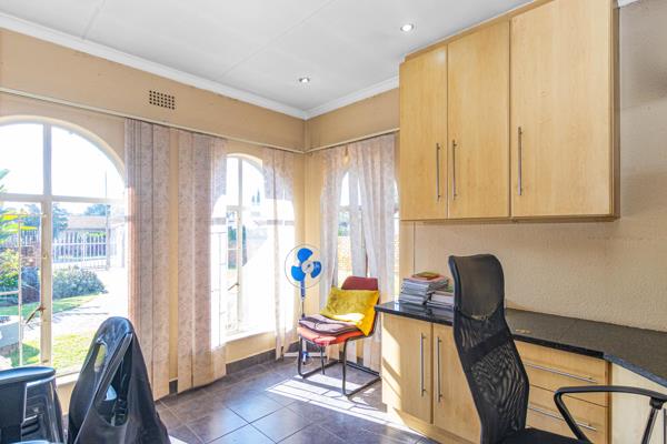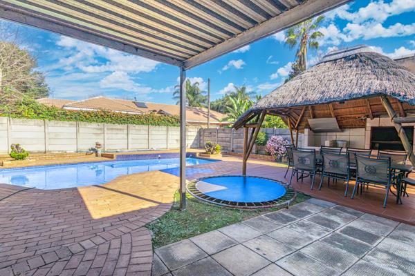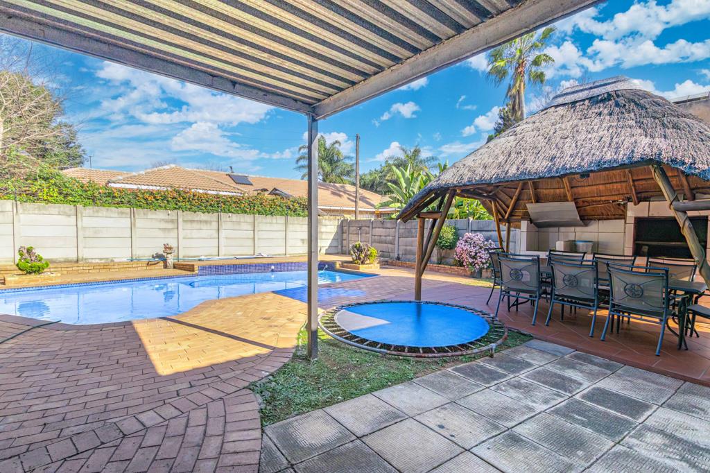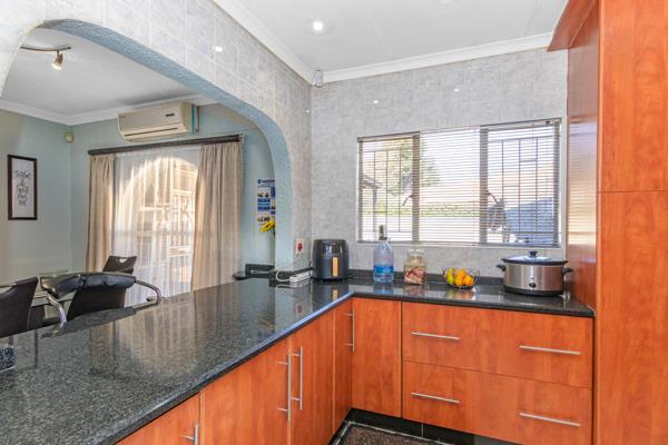 The heart of the home is a stylish and spacious kitchen with granite countertops, a gas stove, space for a double-door fridge, and a charming breakfast nook. A separate dining room, also air-conditioned, provides the perfect space for family meals, while the large lounge features laminate flooring and modern downlighting. An additional bar area flows seamlessly into the outdoor entertainment zone, which includes a thatched lapa with a built-in braai, and a sparkling swimming poolperfect for summer gatherings.