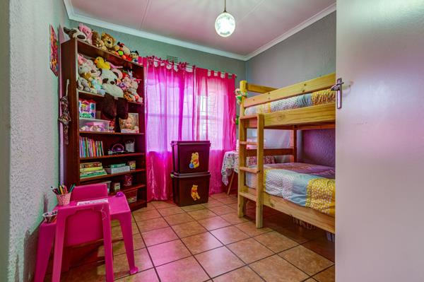 Accommodation includes two well-proportioned bedrooms, one of which is currently configured with space-saving bunk beds, perfect for children or guests. The two bathrooms are fully tiled, featuring a vanity, mirrored cabinet, and a bathtub with an overhead shower attachment, catering to everyday needs. The property''s private backyard offers an established garden with mature bushes and a dedicated braai area, providing an ideal setting for outdoor relaxation and entertaining.