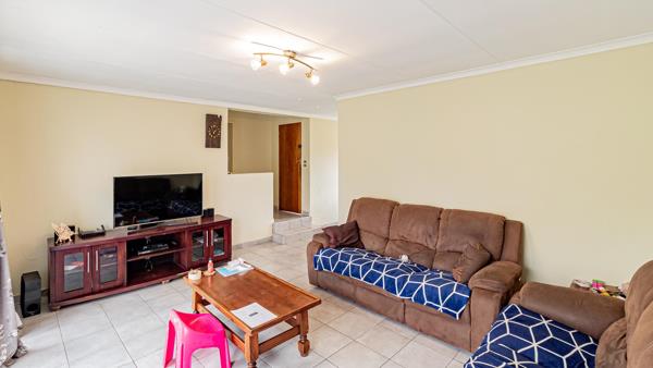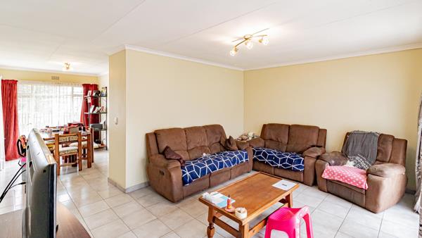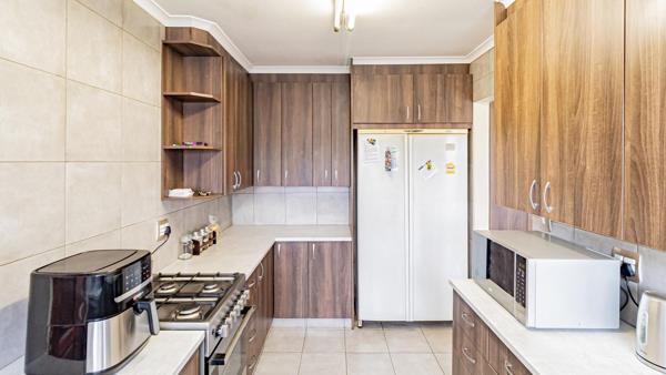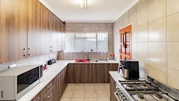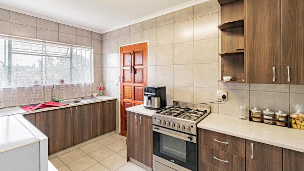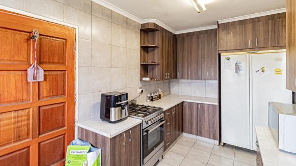 The home features a tiled lounge and dining room, creating comfortable spaces for everyday living and entertaining. The kitchen is fitted with a gas hob, oven, double sink, and a pantry, providing practical cooking and storage space.