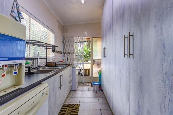 The home features four spacious bedrooms and two bathrooms, including a main bedroom with an en-suite bathroom. The newly renovated full second bathroom adds modern comfort. The open-plan lounge and dining area flow seamlessly into the kitchen, which includes a built-in braai for easy indoor entertaining. The kitchen is fitted with a double eye-level oven, glass hob, scullery with double sink, and space for a dishwasher.