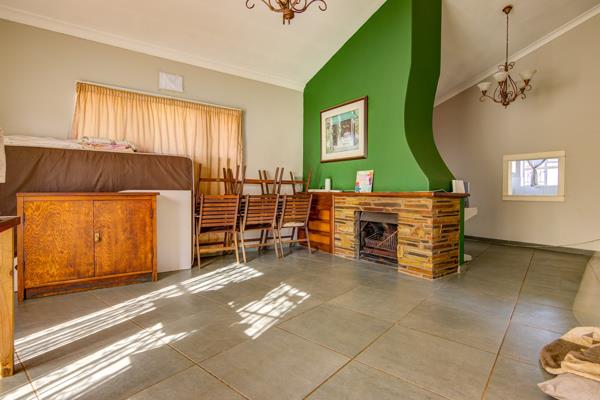 As you step inside, you are greeted by a spacious open-plan lounge and dining room area, seamlessly connected by a central fireplace. This inviting space is ideal for cozy family gatherings or entertaining guests, offering both warmth and style. The original melamine kitchen is functional and well-maintained, featuring an under-counter oven, a four-plate hob, and ample workspace. Adjacent to the kitchen is a practical scullery area, complete with a double sink, large pantry cupboard space, and a serving hatch that opens to the dining areaperfect for effortless meal service.