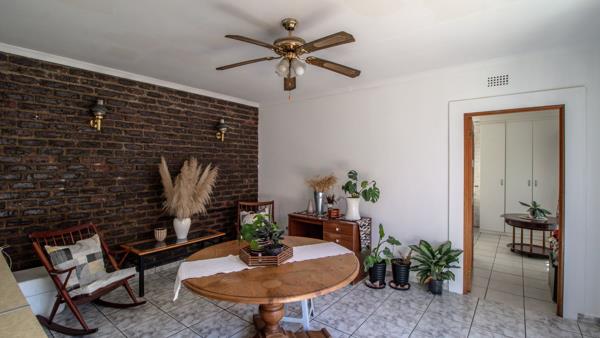 Family Room Comfortable and airy, with tiled floors and a ceiling fan.