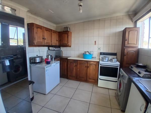 The adjacent kitchen is practical, featuring cupboard space, and a layout that makes everyday cooking effortless.