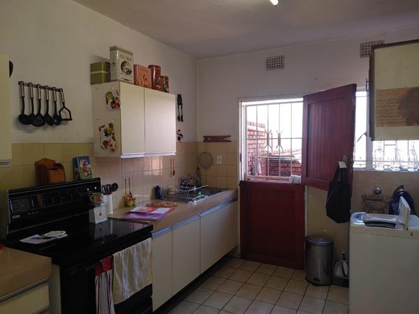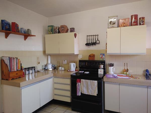 The spacious Kitchen is fitted with ample built in cupboards, double sink, stove & a pantry.