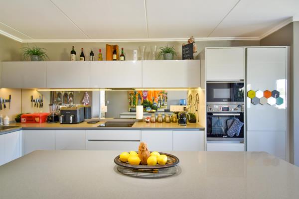 The dining and lounge areas are seamlessly integrated and open onto a spacious covered patio through dual sliding doors. Complete with a built-in braai, this outdoor space offers a tranquil setting to enjoy the estates signature views and lush surroundings.