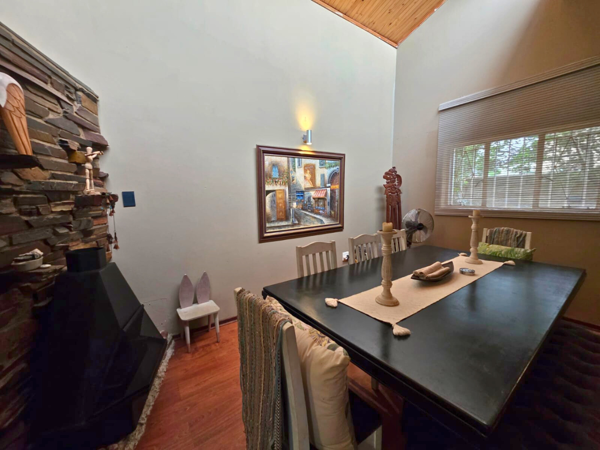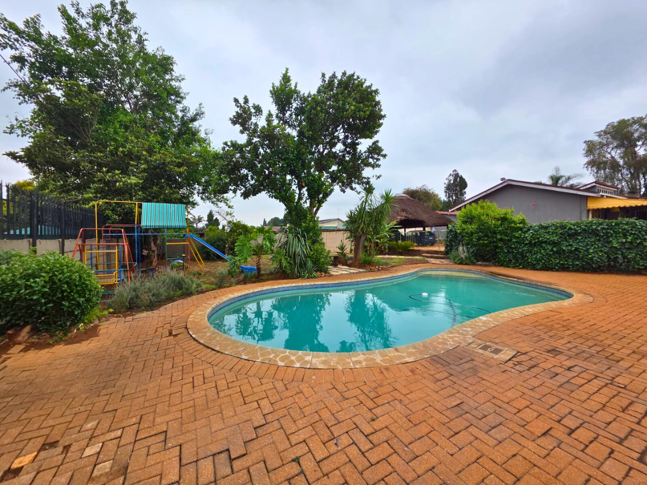 Outdoors, enjoy a covered patio with a built-in braai, overlooking a meticulously maintained garden equipped with a kids jungle gym, trampoline, and a sparkling swimming poolperfect for family gatherings and outdoor fun.