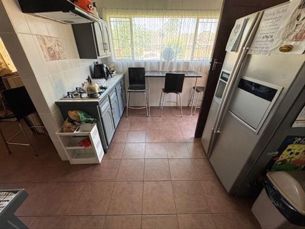 The home features a large tiled lounge and a separate dining room, providing versatile living and entertaining areas. The kitchen is generous in size, boasting tiled floors and walls, wooden cabinetry, a breakfast counter, and a gas stove, perfect for family meals.