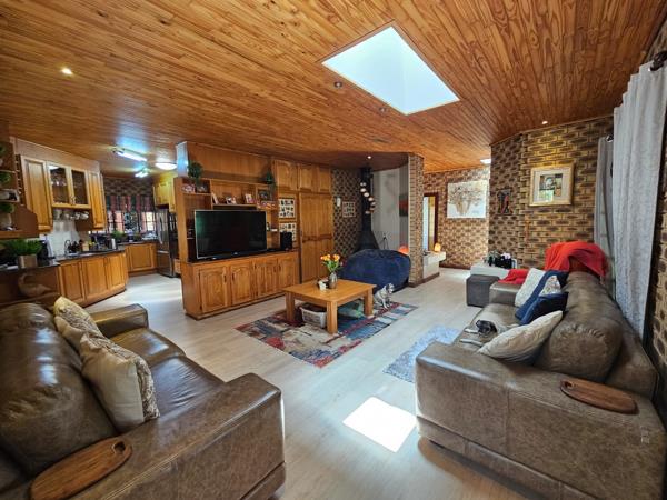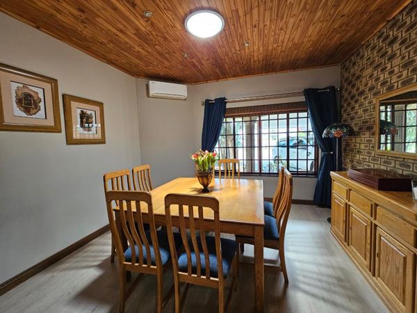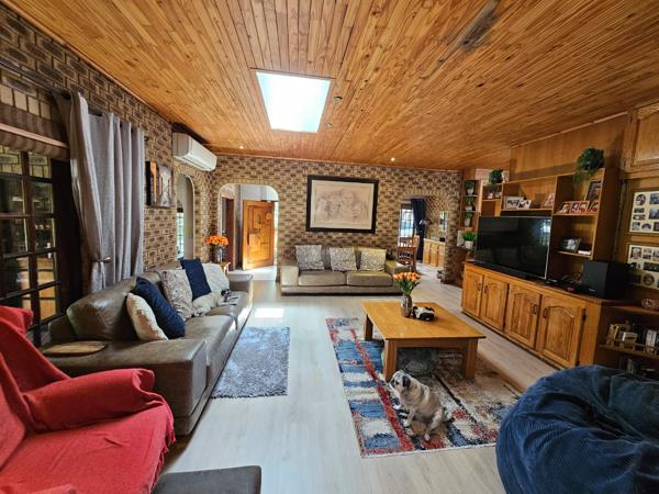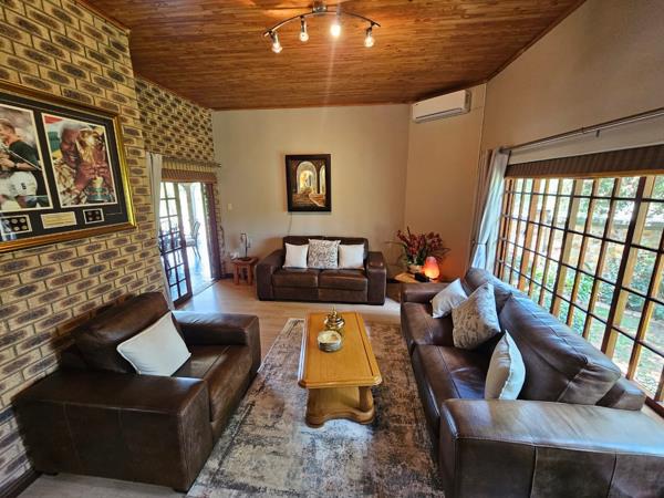 Multiple air-conditioned lounges with French doors open onto an extensive entertainment verandah. A built-in bar, brand-new Jacuzzi, blinds, gas braai, pizza oven with extraction fan, and a twelve-seater outdoor dining set (included in the sale) create the perfect setting for effortless indooroutdoor living.