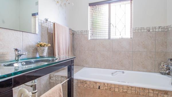 There are three bedrooms, all with built-in cupboards, laminated flooring, and ceiling fans. The main bedroom includes a modern ensuite bathroom with a walk-in shower. A second bathroom, also modern and stylish, offers a combination of half tiled finishes.