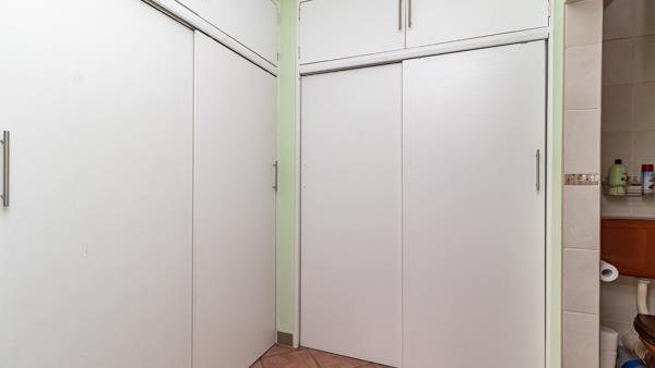 The kitchen features tiled floors and walls, neat melamine cupboards, a four-plate stove with extractor fan, and a convenient pantry cupboard offering practical storage and ease of use.