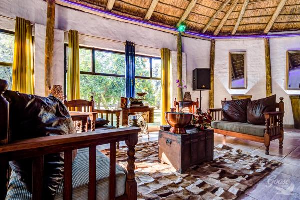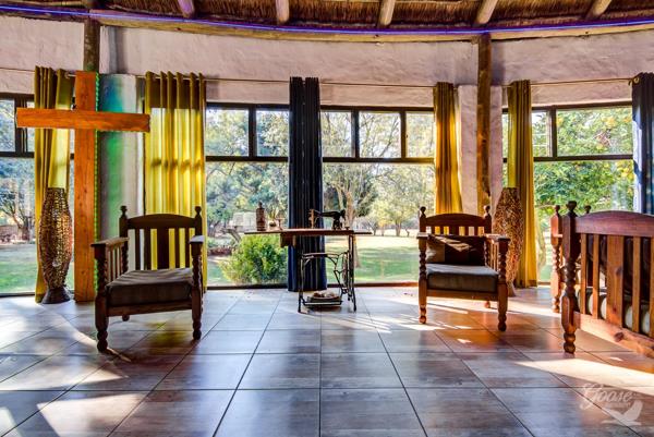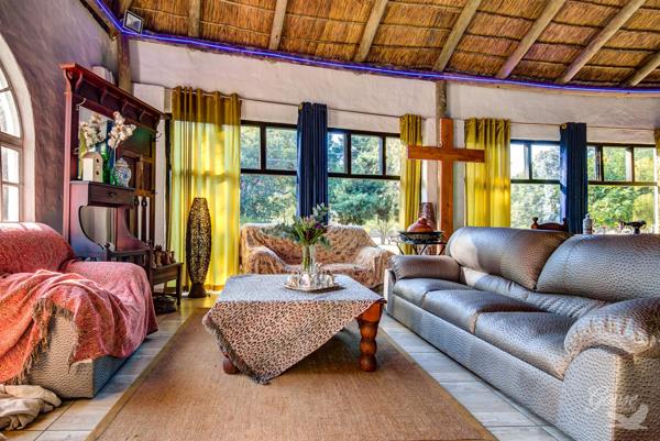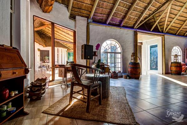 Discover a unique lifestyle opportunity in Bredell, Kempton Park, South Africa, with this distinctive residential property set on an expansive 2.20-hectare erf. The home immediately captivates with its charming thatched roof architecture and white-walled exterior, nestled within a lush, treed garden that offers both privacy and scenic views. This property provides a tranquil escape while remaining conveniently located.