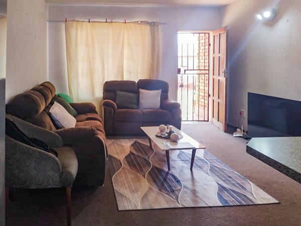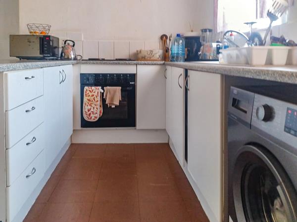 Spacious lounge that is open plan to kitchen. The kitchen features ample built in cupboards and working space, under counter oven with 4 plate hob, space for washing machine and fridge. Back door leads to communal space.