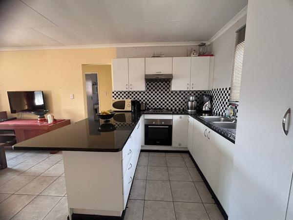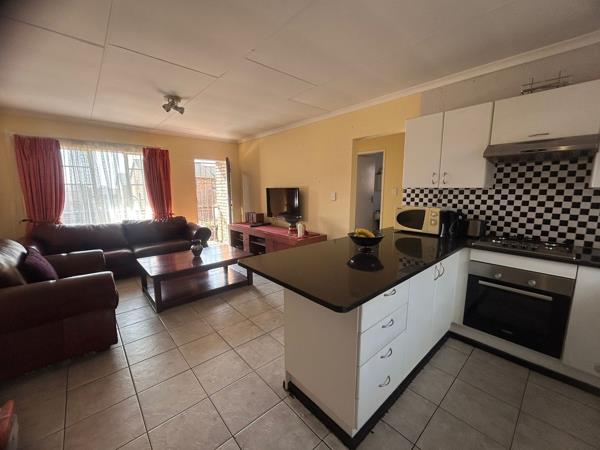 Upon entering, you are greeted by a bright and spacious open-plan kitchen and lounge area. The modern kitchen boasts ample cupboard space, elegant granite countertops, and is fully equipped for load shedding with a 4-plate gas stove, extractor fan, and undercounter oven. The unit also offers the convenience of prepaid electricity.