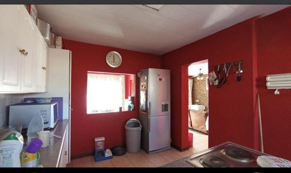 The kitchen has built-in cupboards, countertop space, and room for appliances.