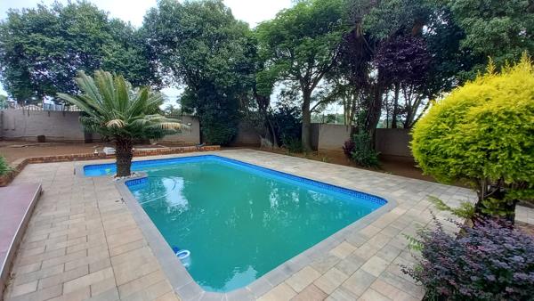 The outdoor spaces are a true highlight, featuring a large, inviting swimming pool with an extensive paved deck, perfect for summer enjoyment. A covered entertainment area with a built-in braai offers an ideal setting for hosting gatherings. The property also benefits from a balcony, providing elevated views of the residential area and surrounding greenery, with potential distant water body views.