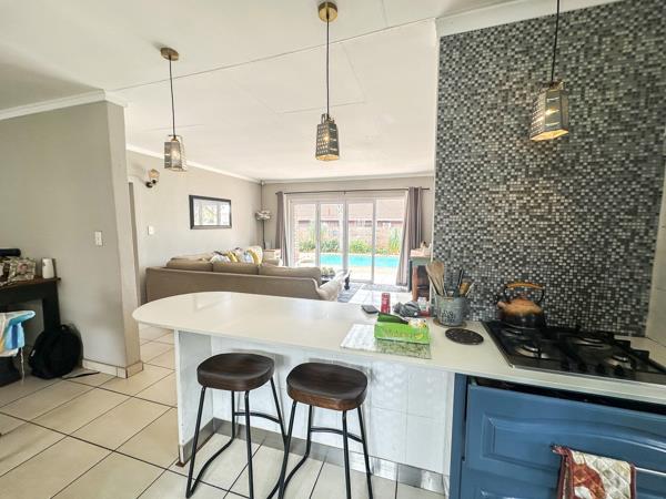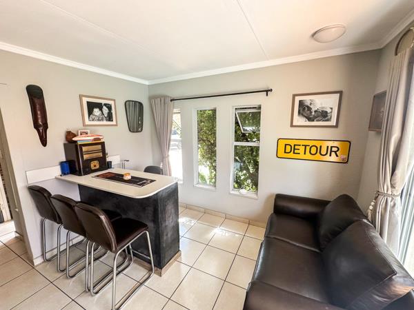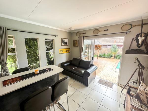 The outdoor area is truly a standout feature, boasting a large swimming pool equipped with solar heating for year-round enjoyment. Perfect for entertaining, the lapa includes a built-in braai, creating an ideal setting for hosting guests. Inside, there is a stylish bar area with sliding doors that open up to the garden, seamlessly blending indoor and outdoor living.