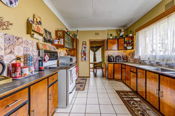 Inside, the living core is wonderfully open: a tiled dining and lounge area flows together for effortless entertaining, anchored by a classic fireplace with a handsome mantel. The kitchen is a standouttrue to era and impeccably preservedwith solid wooden cabinetry, vintage oven/hob combo, glass-front sliders, appliance connection points, a large pantry cupboard, and a handy scullery to keep the worktops clear.