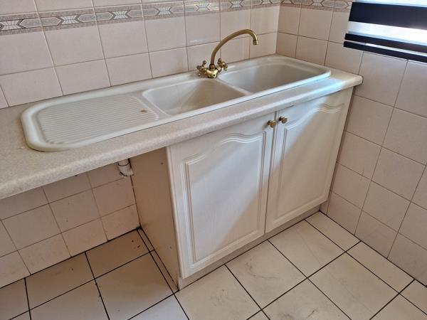 The kitchen has plenty of cupboard space, a double sink, space for undercounter appliances, a freestanding stove, and space for a fridge.