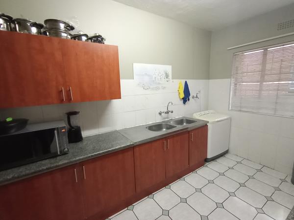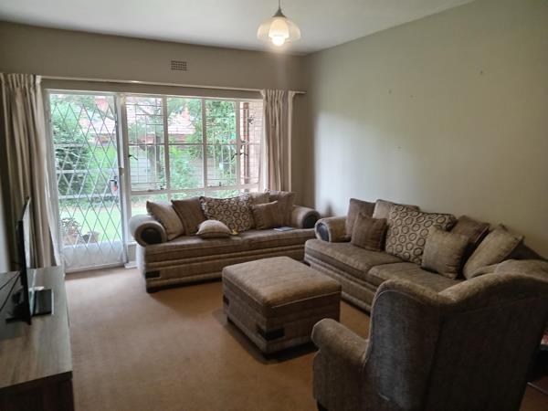 Enjoy family dinners in the separate dining room and unwind in the spacious lounge that opens up to the communal garden, creating a seamless indoor-outdoor living experience. The kitchen is designed for efficiency, offering plenty of cupboard space, an upright stove, and ample room for your appliances.