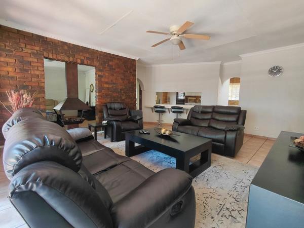 The main house features four generously sized bedrooms and two bathrooms. The main bedroom includes an en-suite bathroom with a separate vanity area and a walk-in closet, while the second bathroom is fitted with a shower. Multiple living spaces include a TV room, dining area, and a spacious living area that flows seamlessly onto a covered patio with a built-in braai perfect for entertaining.