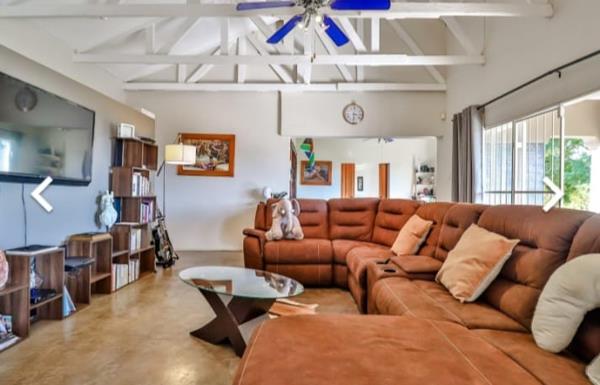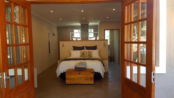 The main farmhouse offers three spacious bedrooms, two en-suite bathrooms, a country-style kitchen, and expansive living areas that open onto a patio. The house is surrounded by a large garden and has ample parking, with security features including an alarm system, CCTV, and solar lighting. The property is also serviced by two boreholes, each capable of supplying 4,000 liters per hour.