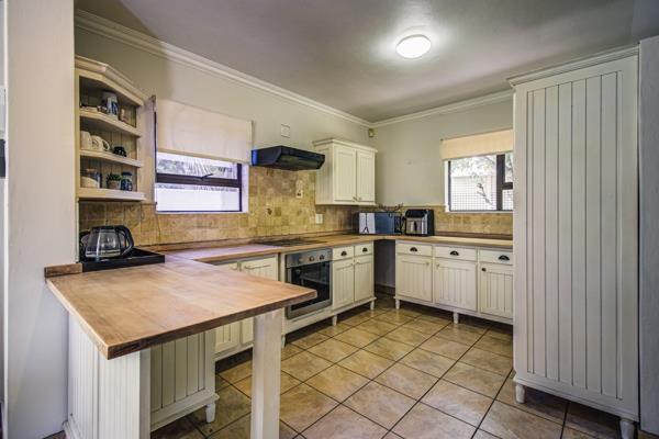 Downstairs, a spacious open-plan layout welcomes you featuring a large lounge with underfloor heating that flows effortlessly to the covered entertainment area with a built-in braai and a lush, manicured garden. The kitchen offers solid wood countertops, ample cupboard space, and a separate laundry area, complemented by a stylish guest toilet. The impressive double blasted-glass front doors add a modern touch of luxury.