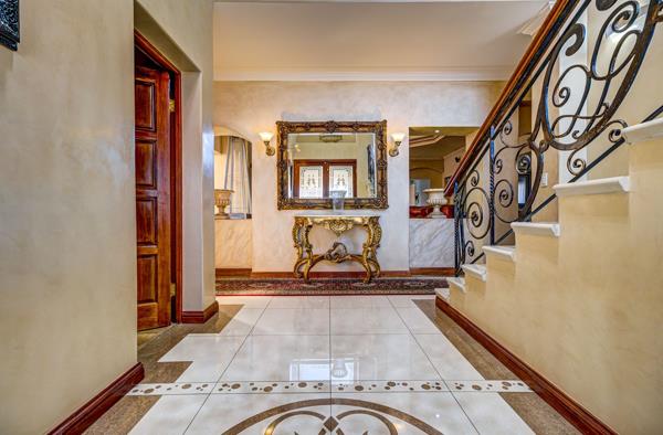 The Barroom with a solid Rosewood bar and ANOTHER Lounge overlooking the heated indoor pool with an impressive skylight dome. The barroom also in turn leads into the indoor Braai Room and wine cellar for the wine connoisseur. This area is an entertainers dream come true!!
