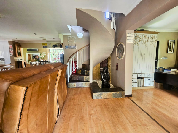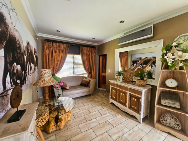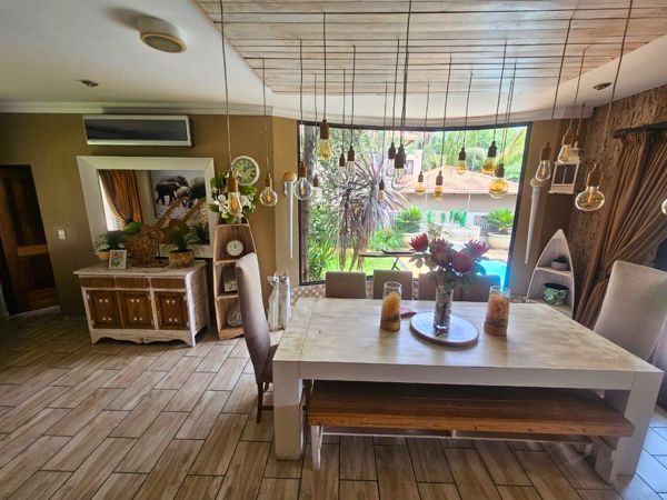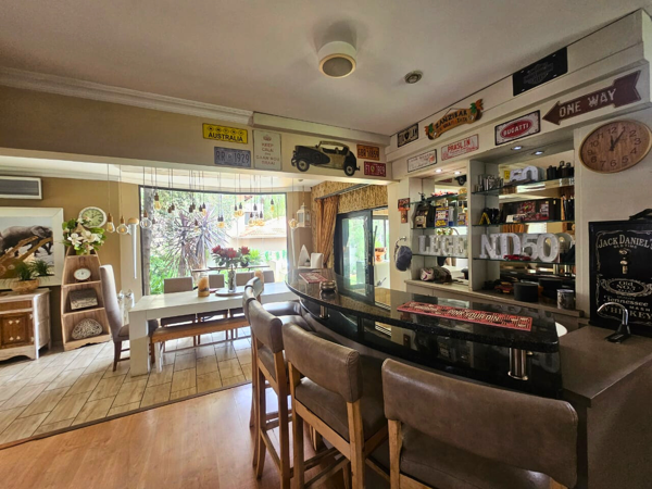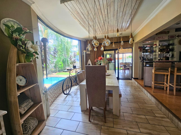 The impressive entrance welcomes you with a striking light fixture and double glass doors, leading into the spacious interior. The home features two lounges, each beautifully designed with impressive light fittings that enhance the ambiance. The open-plan dining room boasts a built-in bar and flows seamlessly into the enclosed patio, offering an ideal space for both relaxed and formal entertaining.