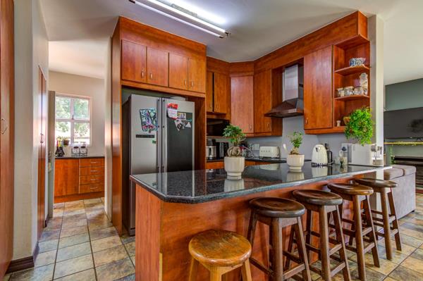 Upon entering, you are welcomed by a spacious open-plan living area that effortlessly connects the lounge, dining room, and kitchen. This inviting space is enhanced by a charming fireplace and filled with natural light streaming through modern aluminium doors, which open out onto the patio, braai area, and a beautifully maintained garden. The kitchen is both stylish and functional, providing space for a double-door refrigerator, a separate scullery to accommodate appliances, and a generous walk-in pantry that offers excellent additional storage.