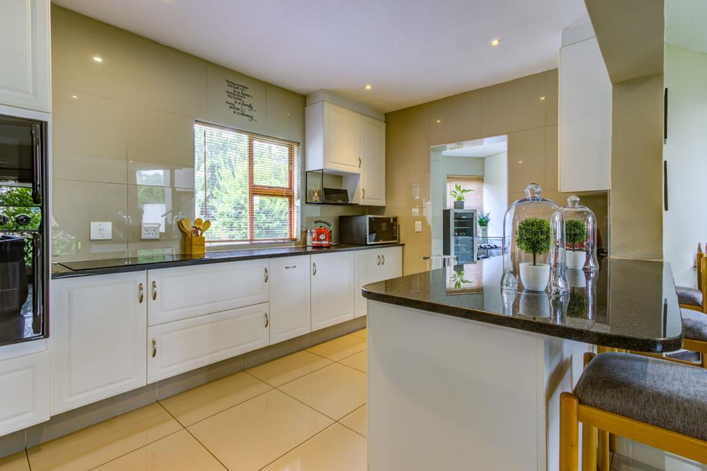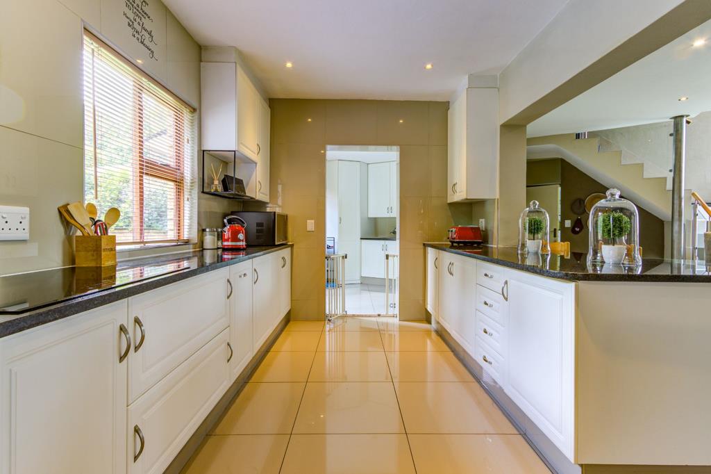 The downstairs living areas flow seamlessly in an inviting open-plan layout. A comfortable lounge and a sophisticated dining room extend towards a stunning kitchen that perfectly balances style and functionality. Finished with beautiful granite countertops, extensive cupboard space, and plentiful working surfaces, the kitchen offers a double eye-level oven, space for a large double-door fridge, and room for all your essential appliances. Complementing this is a well-sized pantry and an impressively large scullery that supports easy, organised living. A guest toilet adds further convenience, while four automated garages provide secure parking and additional storage capacity. The full staff quarters, currently utilised as a laundry, offer valuable versatility for household needs.