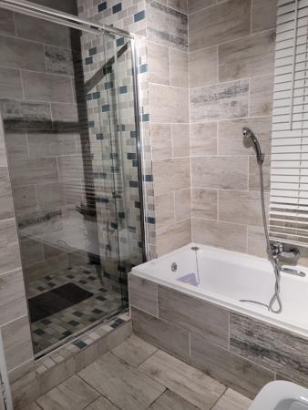 The residence comprises three well-proportioned bedrooms, each benefiting from natural light, providing comfortable private spaces. The main bedroom features a stylish channel-tufted headboard, adding a touch of elegance. The single bathroom is tastefully finished with modern wood-look and mosaic tiling, offering both a separate glass-enclosed shower and a bathtub for ultimate convenience.