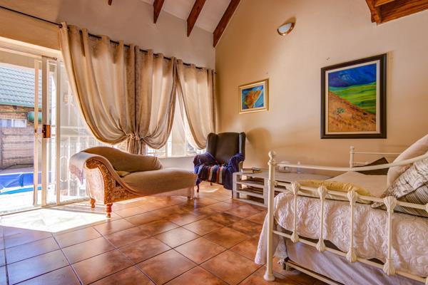Attached to the house is a large tiled family room, large enough to be used as an entertainment area, office or playroom for the kids. This family room overlooks the sparkling blue pool. A double garage plus a single garage, 2 carports and a single allocated parking bay is totally unheard of in a complex. Pet friendly complex, so bring your small doggie. Just down the road of Kruinsig Laerskool, Shangrila School, churches and shopping centres.