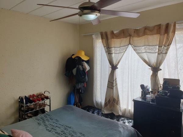 Spacious, sun splashed north facing main bedroom with ceiling fan and built in cupboards, 2nd bedroom with built in cupboards and shared bathroom with bath/shower combo, toilet and basin.