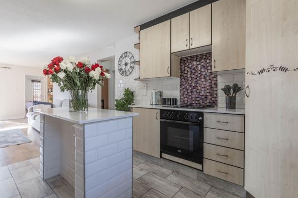 Kitchen with Caesarstone tops and stylish lightwood cupboards, as well as open plan lounge dining on entrance which accesses the spacious, sun-splashed garden and pool through aluminium doors.
