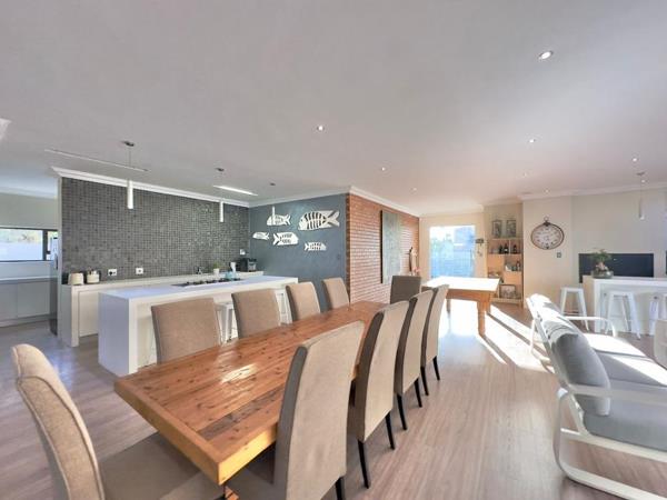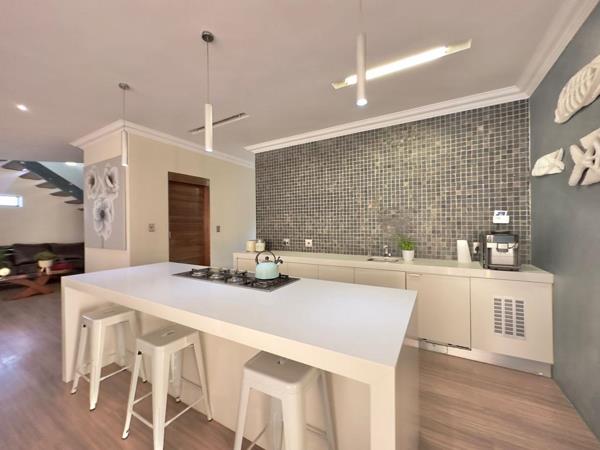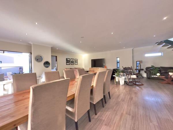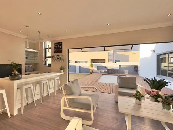 The home features a private study, ideal for working from home, and a stunning open-plan kitchen seamlessly flowing into the living and braai areas. The gourmet kitchen is fitted with gas appliances, a spacious scullery, and a built-in pizza oven, perfect for entertaining.