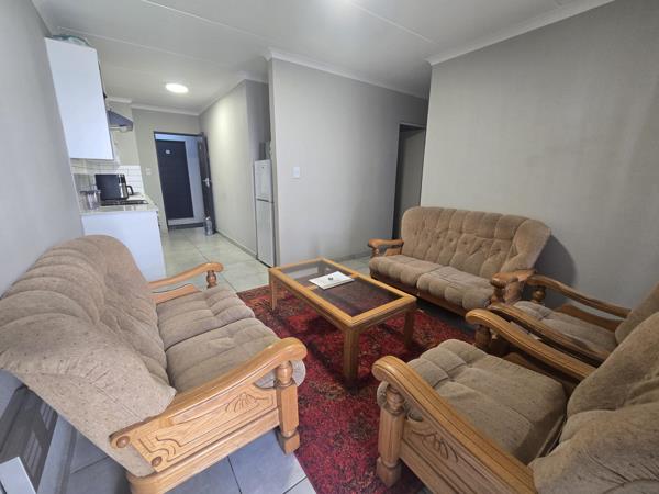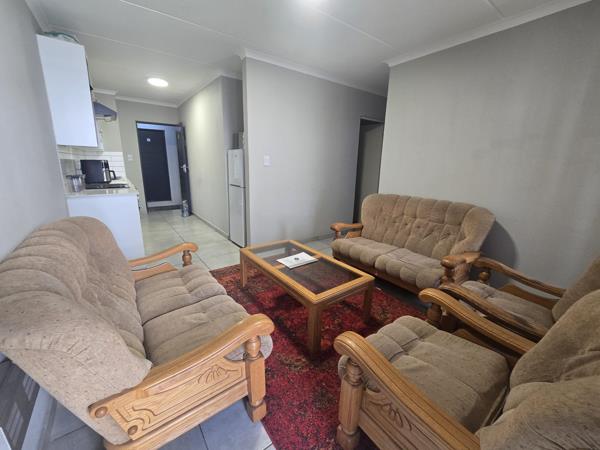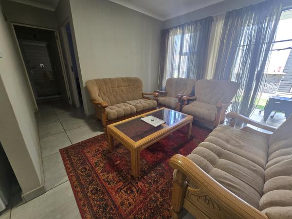 Lounge area leading to a covered balcony with a built-in braai perfect for year-round entertaining!