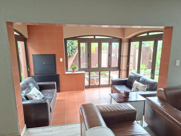 As you step into the foyer, you''re immediately welcomed into a stunning lounge area, were elegance and comfort blend seamlessly. The beautifully appointed space unfolds before you, inviting relaxation and conversation. Soft, natural light pours in, highlighting the room''s refined features and creating a warm, inviting atmosphere that''s perfect for unwinding or entertaining. The second living area is perfect for entertainment with a braai area, it is flowing seamlessly through sliding doors onto the garden ideal for lively gatherings or quiet evenings.