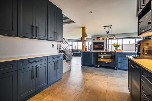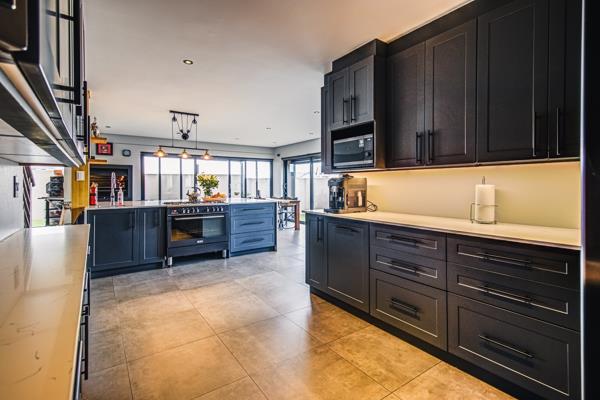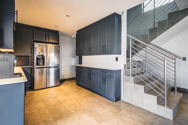 Discover modern living in this sophisticated residential sale property located within a secure estate in Glen Marais, Kempton Park, South Africa. Spanning a generous 328 sqm floor size and 3 levels on a 409 sqm erf, this home is designed for contemporary comfort and style. The interior boasts an expansive open-plan layout, seamlessly connecting the living, dining, and kitchen areas. The state-of-the-art kitchen features sleek dark cabinetry, pristine white marble-patterned countertops, a large central island with an integrated gas hob and seating, and high-end stainless steel appliances including a range cooker and integrated ice machine. Ample storage, under-cabinet lighting, and durable grey tile flooring enhance both functionality and aesthetic appeal.