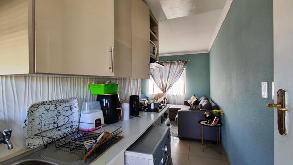 The home features a neat open-plan kitchen designed for both practicality and ease of living. It is fitted with a built-in stove and undercounter oven, melamine countertops, and offers dedicated connections for a dishwasher or washing machine. The kitchen flows seamlessly into the open-plan tiled lounge, creating a welcoming space for everyday living and entertaining. DSTV and fibre connections are already in place, ensuring modern connectivity and convenience.