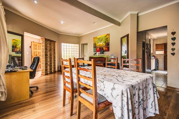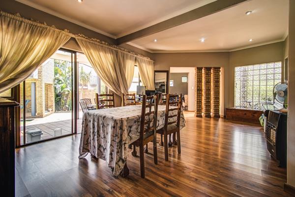 The home offers a stunning lounge with laminated flooring, flowing seamlessly into an open-plan dining room, also finished with laminated floors. Glass sliding doors open onto a large, fully tiled covered patio, ideal for entertaining while overlooking the sparkling pool and outdoor living area.