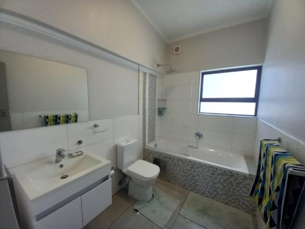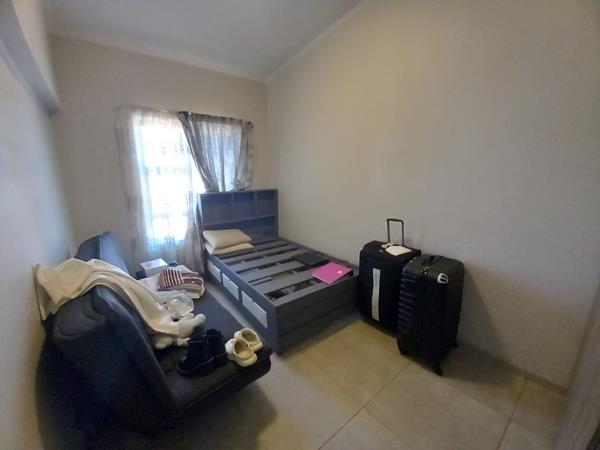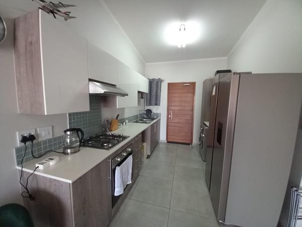 The townhouse offers two well-sized bedrooms, both beautifully tiled. The main bedroom includes a private en-suite bathroom, providing added comfort and convenience. Large aluminium windows throughout the home allow an abundance of natural light to flow in, enhancing the sense of space and modern appeal.